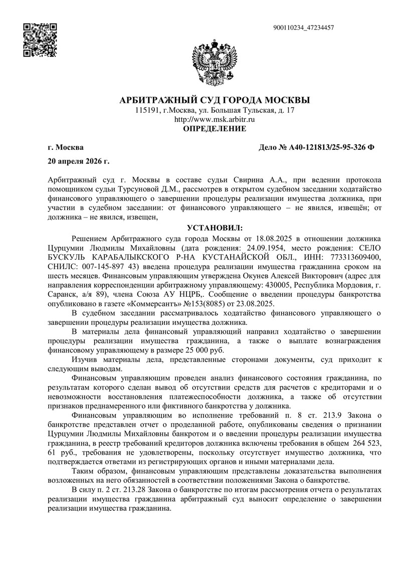 Еще одно дело в копилке ДОЛГАМ.НЕТ: Арбитражный суд г. Москвы рассмотрел отчет финансового управляющего и завершил процедуру реализации имущества гражданина. Судебный акт вынесен 20 апреля 2026 года, судья — А.А. Свирин.