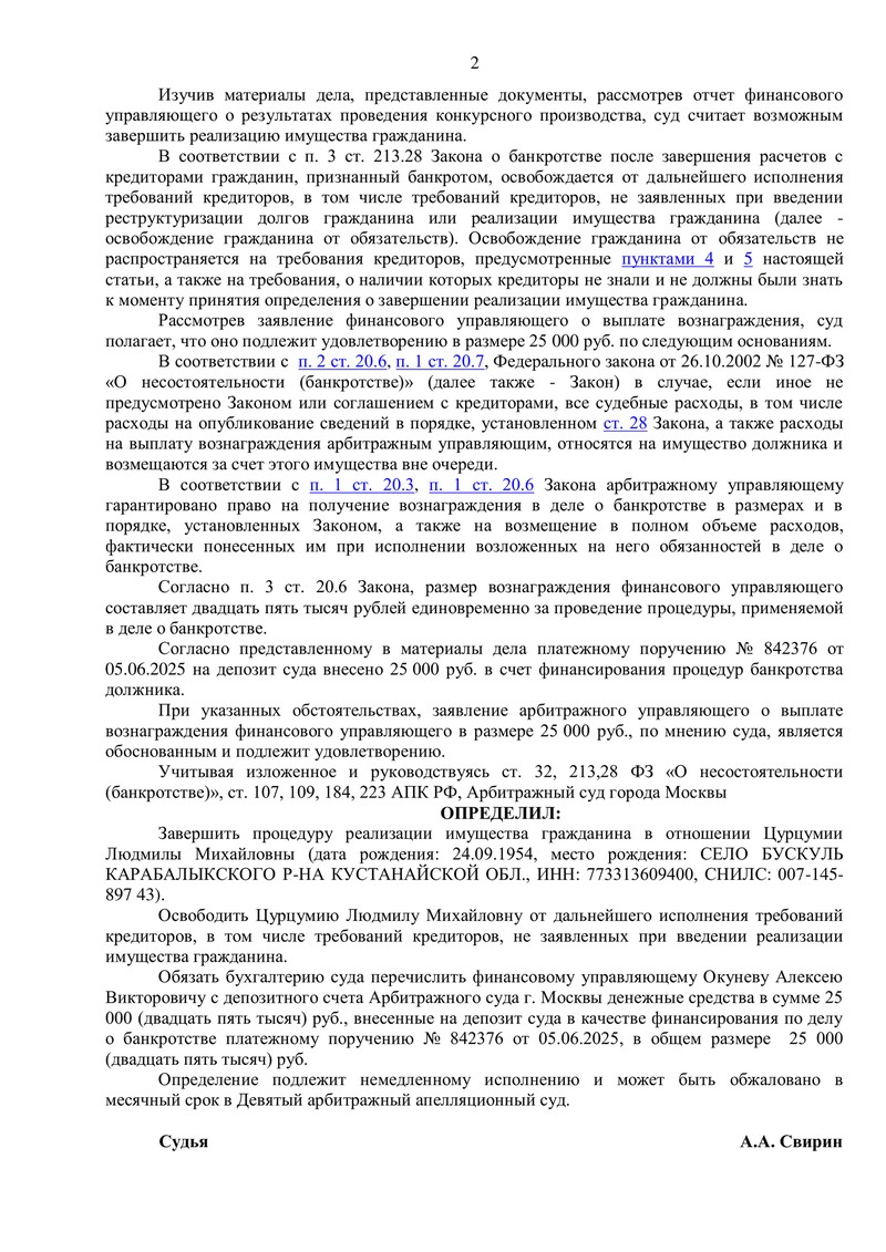 Суд также рассмотрел вопрос вознаграждения финансового управляющего и определил выплатить 25 000 руб. с депозитного счета суда (денежные средства были внесены по платежному поручению №842376 от 05.06.2025). Это стандартная сумма вознаграждения, установленная законом за проведение процедуры.