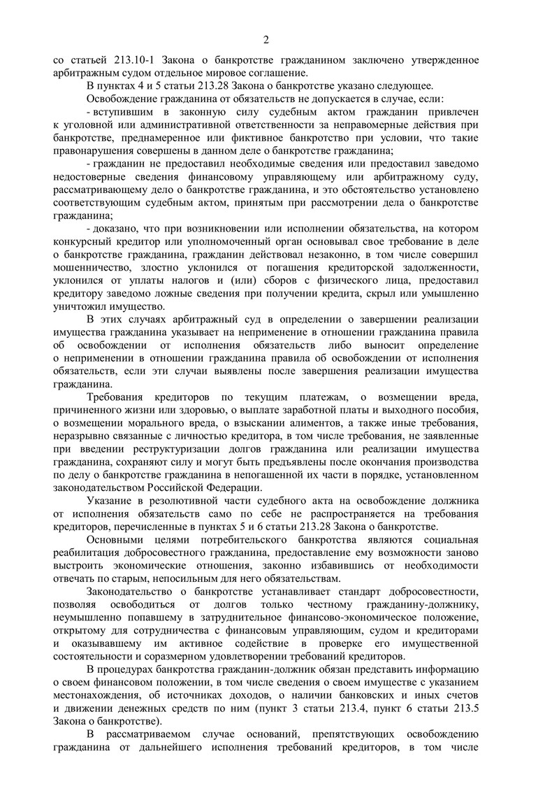 Рассмотрев отчет, суд определил завершить реализацию имущества и освободить гражданина от дальнейшего исполнения требований кредиторов, включая требования, которые не были заявлены в процедуре (за исключением случаев, прямо указанных в п. 4–5 ст. 213.28 Закона о банкротстве — например, по алиментам, вреду здоровью, отдельным текущим платежам и иным «личным» обязательствам).