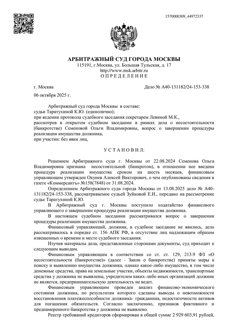 В октябре 2025 года Арбитражный суд города Москвы вновь подтвердил высокий профессионализм юристов компании "ДОЛГАМ.НЕТ", завершив процедуру реализации имущества нашего клиента. В рамках дела № А40-131182/2024 суд принял судьбоносное для гражданина решение — полное освобождение от исполнения долговых обязательств перед кредиторами, что ознаменовало новый этап его жизни.