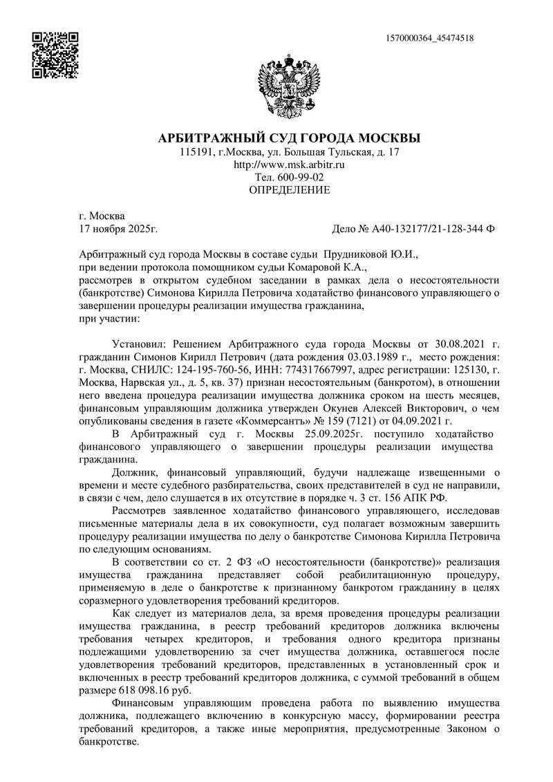 - Дата определения суда о завершении процедуры: 17 ноября 2025 года