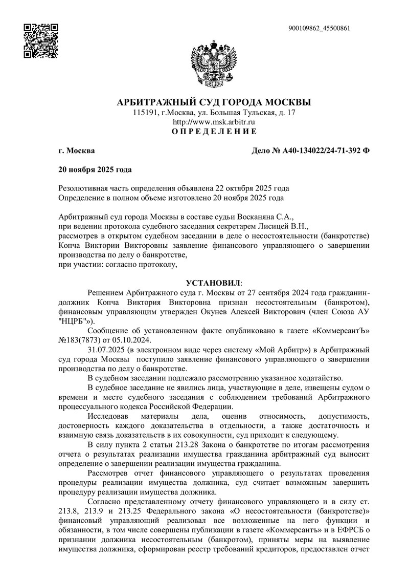 В ноябре 2025 года Арбитражный суд города Москвы завершил процедуру реализации имущества в рамках дела № А40-134022/2024 и полностью освободил очередного клиента компании ДОЛГАМ.НЕТ от долгов. Это еще один яркий пример того, как компетентное юридическое сопровождение приводит к реальному финансовому освобождению!