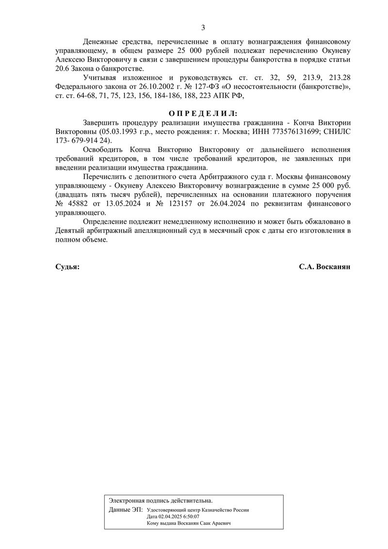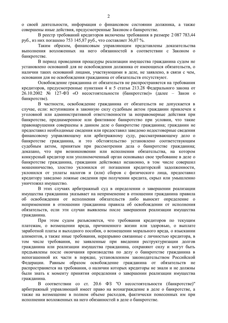 Суд вынес определение о завершении процедуры банкротства и освободил клиента ДОЛГАМ.НЕТ от исполнения обязательств на сумму более 2 миллионов рублей! Таким образом, очередной житель Москвы получил возможность начать новую жизнь — без кредитных оков и навязчивых звонков коллекторов. Решение вступило в силу и подлежит немедленному исполнению.