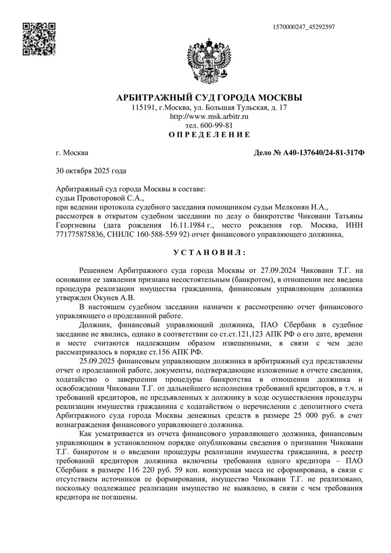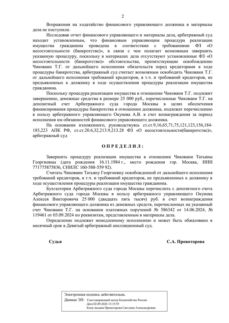 Арбитражный суд города Москвы завершил процедуру банкротства в отношении нашей клиентки, рассмотрев отчёт финансового управляющего и не обнаружив оснований для отказа в её освобождении от долгов. Решение суда — показательный пример эффективной юридической поддержки со стороны команды ДОЛГАМ.НЕТ и свидетельство того, что даже в сложных финансовых ситуациях можно добиться полного списания обязательств.
