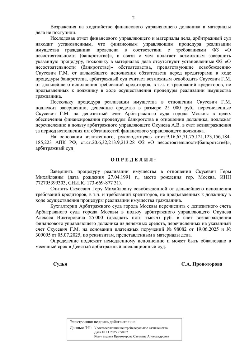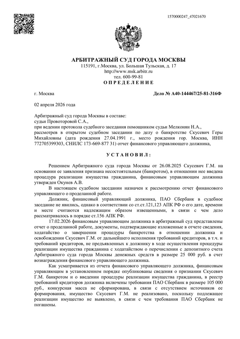 Арбитражный суд города Москвы рассмотрел отчет финансового управляющего и 02 апреля 2026 года по делу № А40-144467/2025 вынес определение, которым завершил процедуру реализации имущества гражданина и освободил нашего клиента от дальнейшего исполнения требований кредиторов, включая требования, которые не были заявлены в ходе процедуры. Это еще один результат работы юридической компании ДОЛГАМ.НЕТ, где банкротство доводится до логичного финала — законного списания долгов.