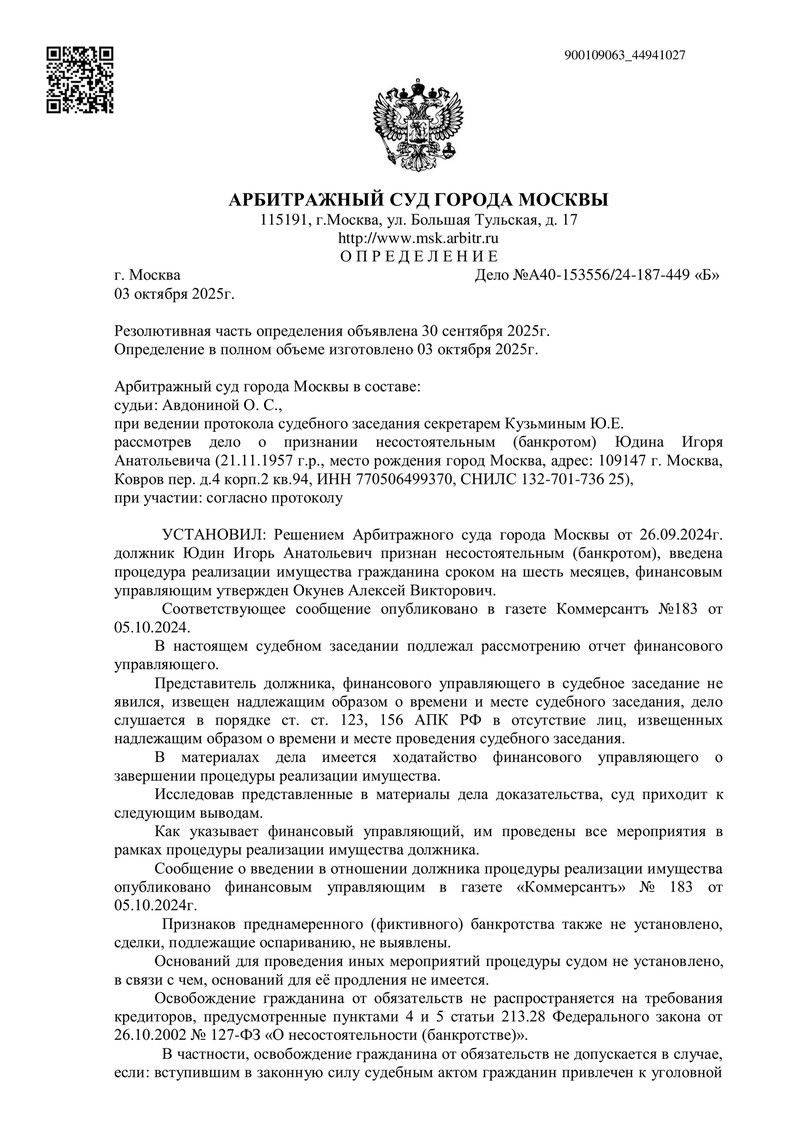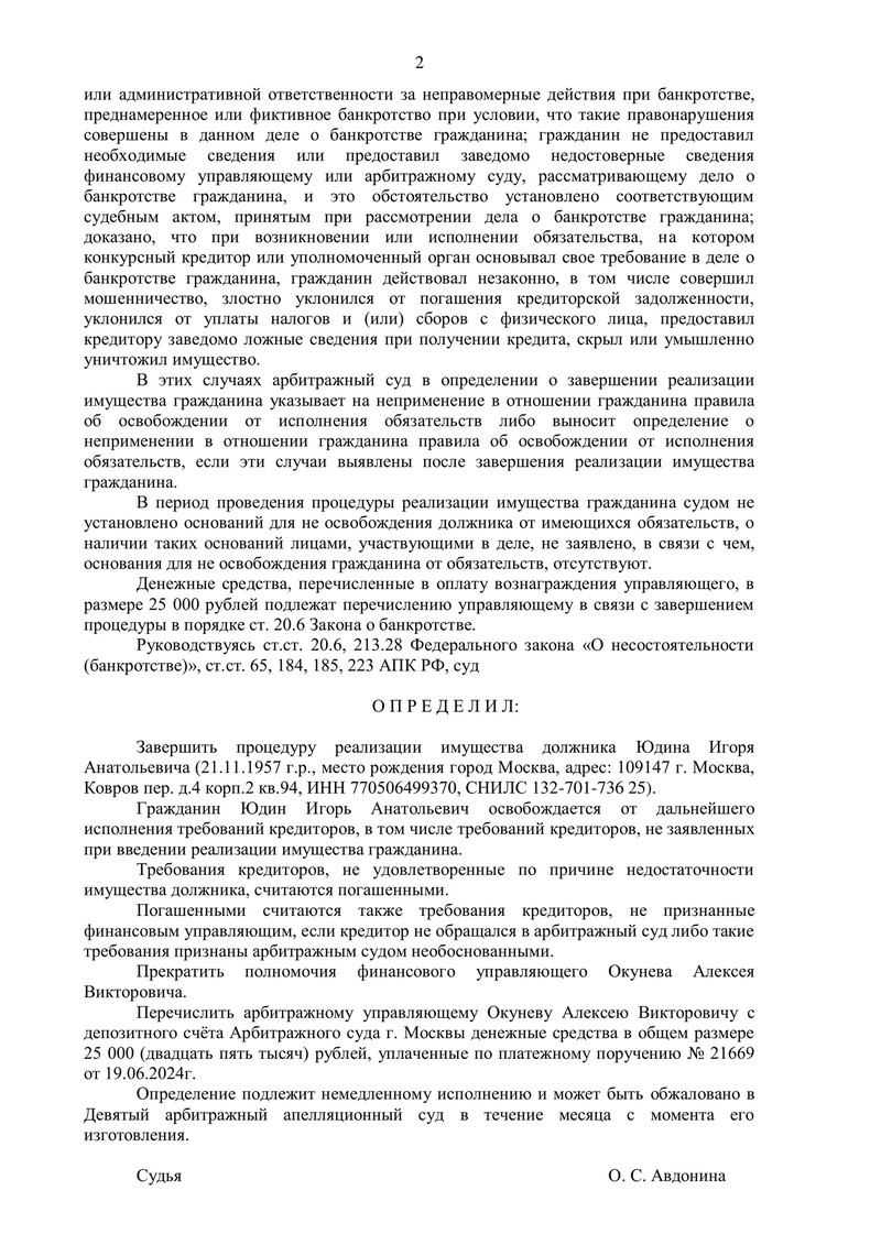 Суд определил завершить процедуру реализации имущества гражданина и освободить его от дальнейшего исполнения требований кредиторов, включая и те, которые не были заявлены или признаны необоснованными. Это значит, что все долги, оставшиеся после завершения процедуры, считаются погашенными, а наш клиент полностью освобождается от финансового бремени!