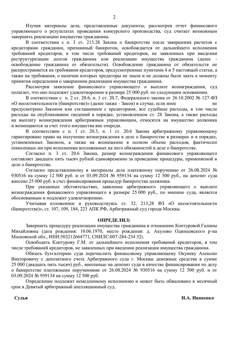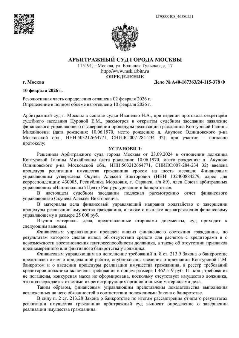 Процедура банкротства была запущена решением суда от 23.09.2024. 10.02.2026 судья рассмотрел ходатайство финансового управляющего о завершении процедуры. К этому моменту была проделана вся необходимая работа, предусмотренная Законом о банкротстве: