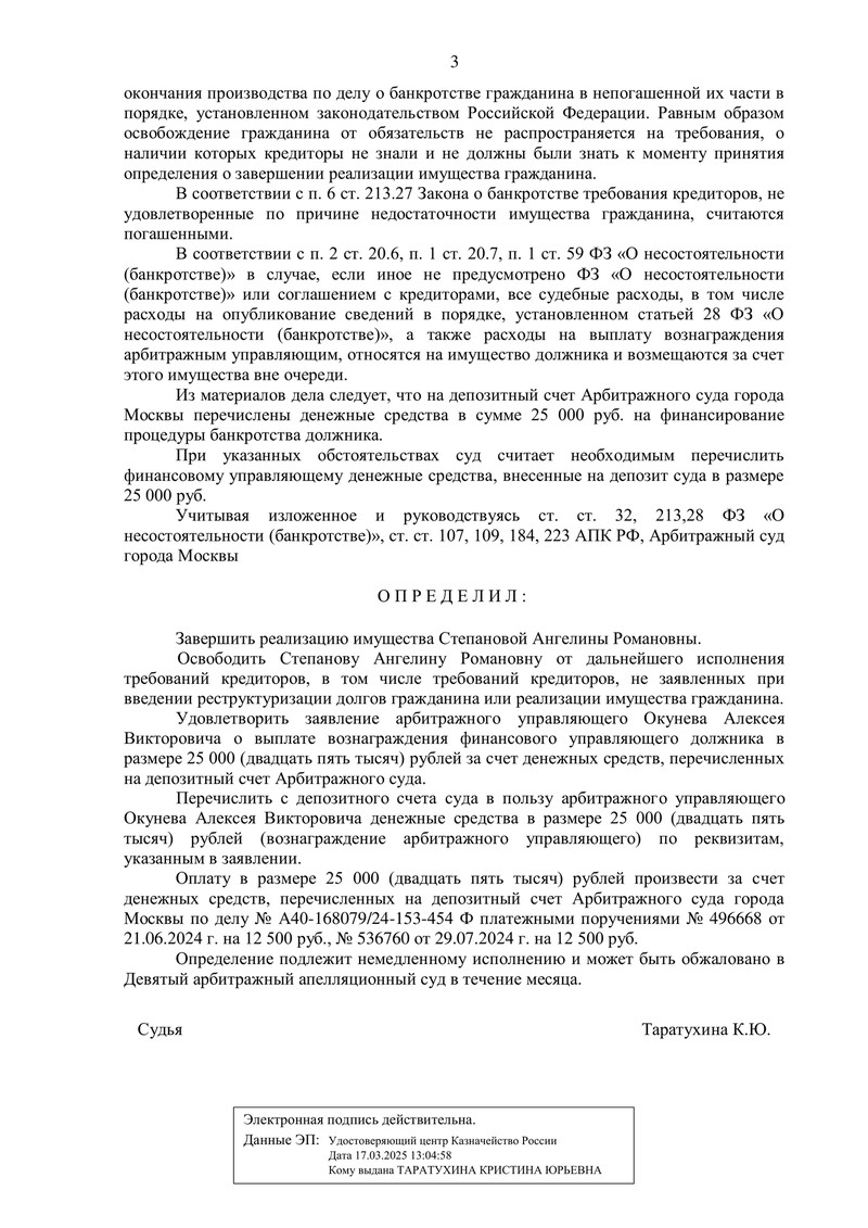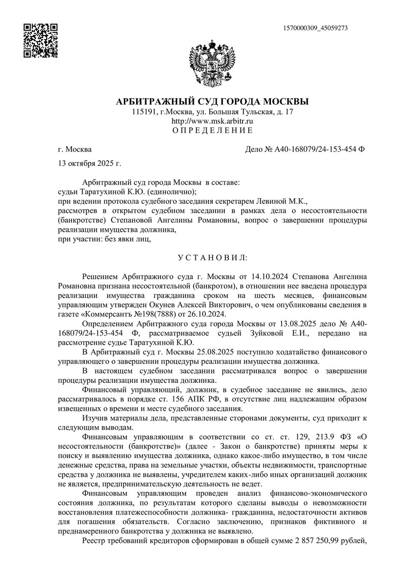 13 октября 2025 года Арбитражный суд города Москвы рассмотрел дело №А40-168079/2024 и завершил процедуру реализации имущества. Определением суда еще один клиент компании "ДОЛГАМ.НЕТ" освободился от долгов!