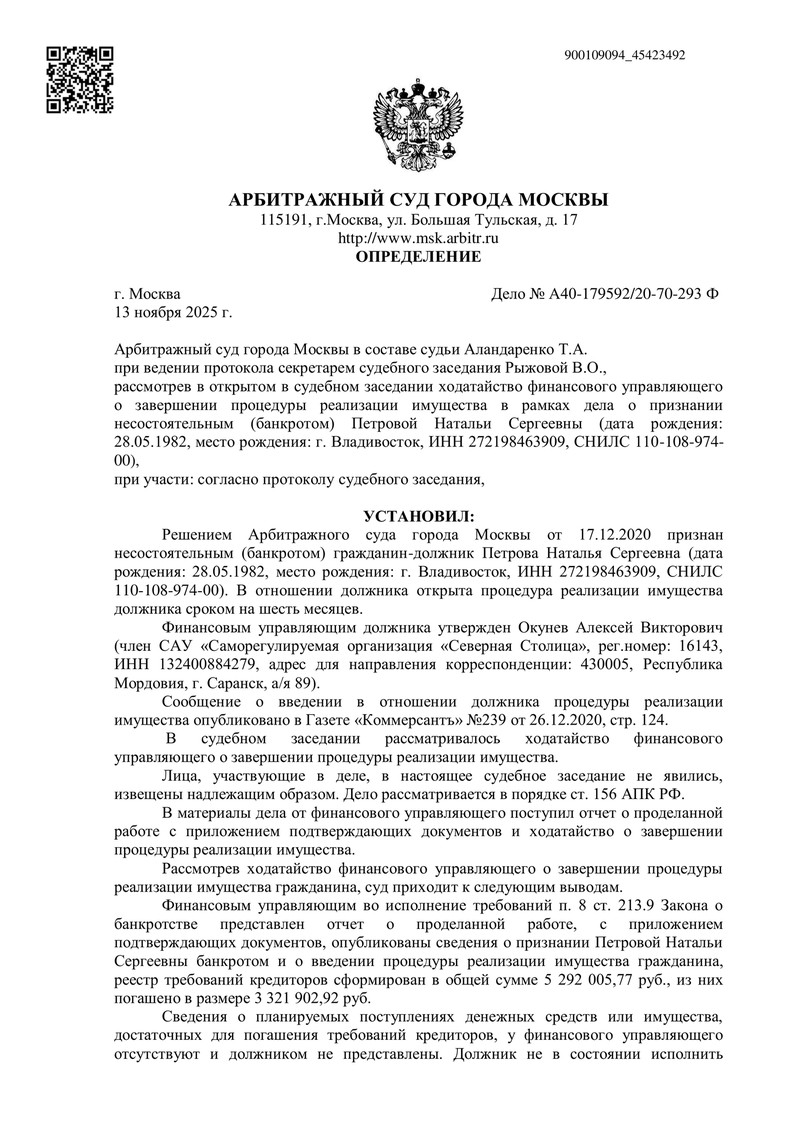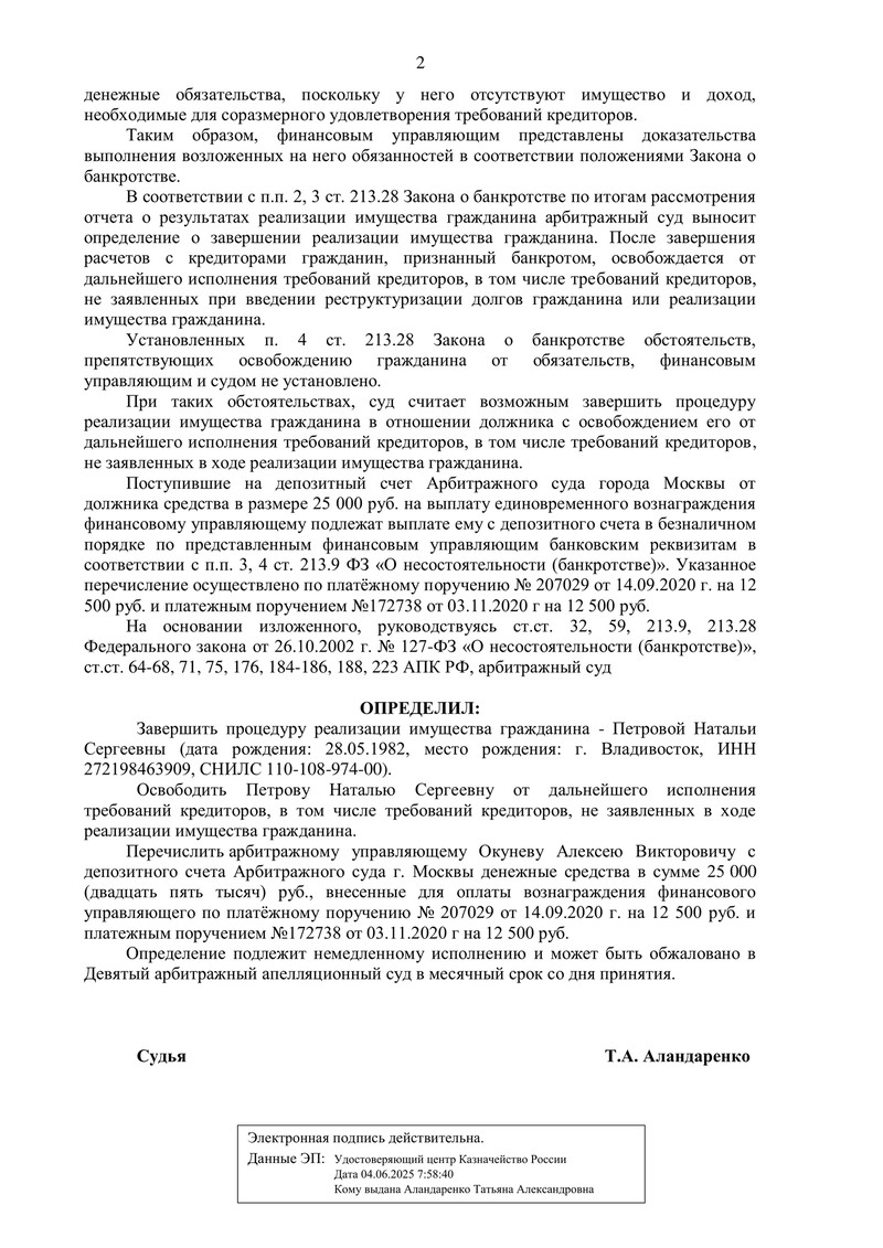 13 ноября 2025 года Арбитражный суд города Москвы, рассмотрев ходатайство финансового управляющего, вынес определение о завершении процедуры реализации имущества по делу № А40-179592/2020. Суд рассмотрел отчет управляющего и пришёл к выводу об отсутствии препятствий для освобождения гражданина от всех долгов, в том числе и не заявленных в процедуре банкротства.