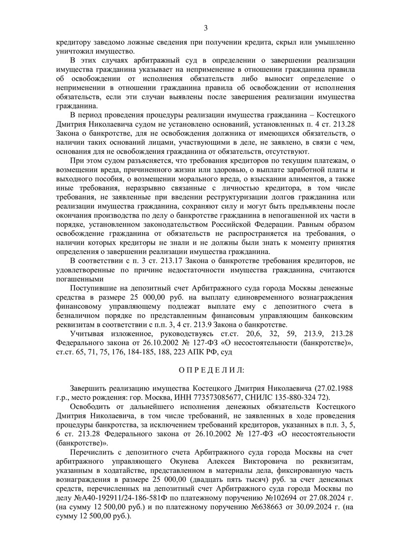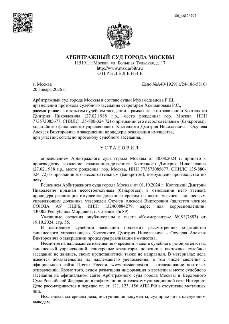 Дело № А40-192911/2024: Арбитражный суд Москвы завершил процедуру банкротства физического лица и освободил гражданина от долгов
