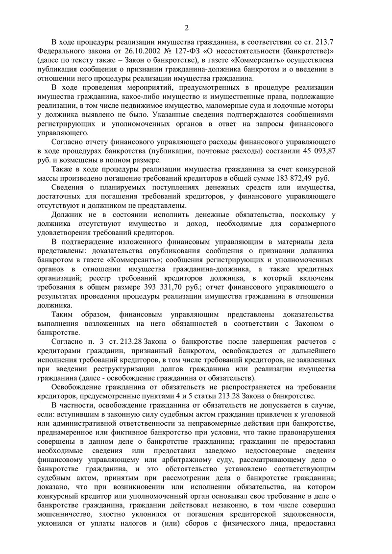С учетом представленного отчета и при отсутствии оснований для отказа в освобождении от обязательств суд определил завершить реализацию имущества и освободить гражданина от дальнейшего исполнения денежных обязательств, включая требования кредиторов, не заявленные в ходе процедуры, за исключением требований, перечисленных в статье 213.28 Закона о банкротстве (например, отдельные обязательства личного характера и иные исключения, установленные законом).