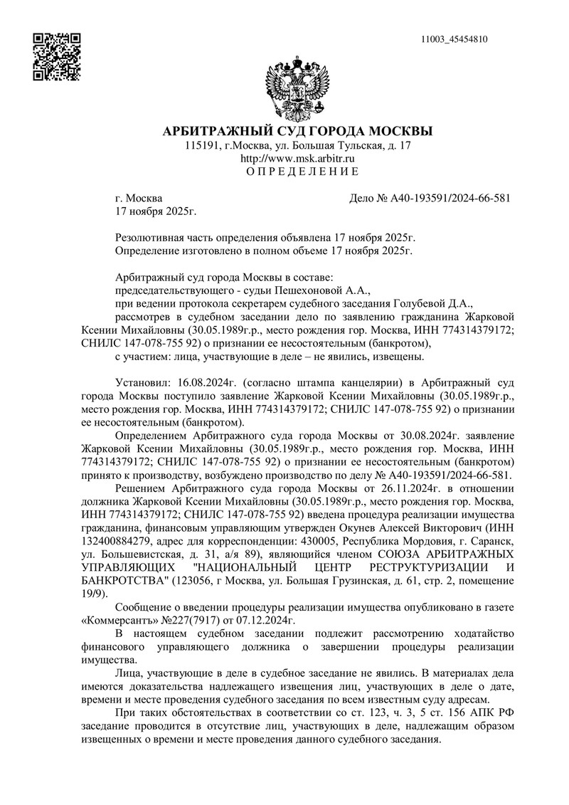 Арбитражный суд города Москвы рассмотрел заявление о признании банкротом еще одного нашего клиента. Заседание проходило под председательством судьи Пешехоновой А.А., а права и законные интересы кредиторов защищал опытный финансовый управляющий Окунев Алексей Викторович. Благодаря скрупулёзной работе специалистов ДОЛГАМ.НЕТ, результат оказался максимально благоприятным для нашего клиента.