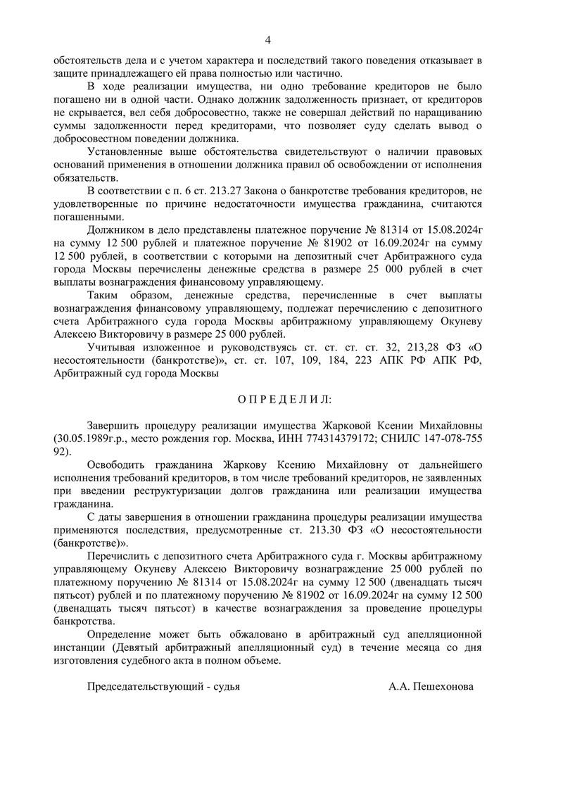 - В качестве оплаты вознаграждения финансовому управляющему были перечислены средства в размере 25 000 рублей в виде двух платежей по 12 500 рублей, что свидетельствует о прозрачности процедуры и хорошем взаимодействии между судом, управляющим и нашим клиентом.