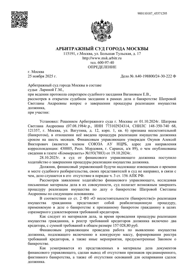 Арбитражный суд города Москвы вынес определение по делу №А40-198800/2024. Еще один клиент компании "ДОЛГАМ.НЕТ" полностью избавился от долгового бремени благодаря поддержке наших юристов!