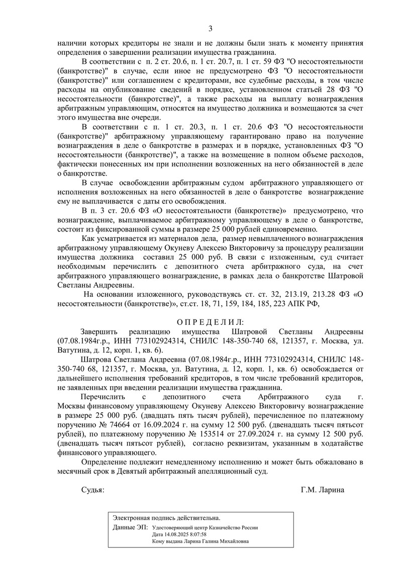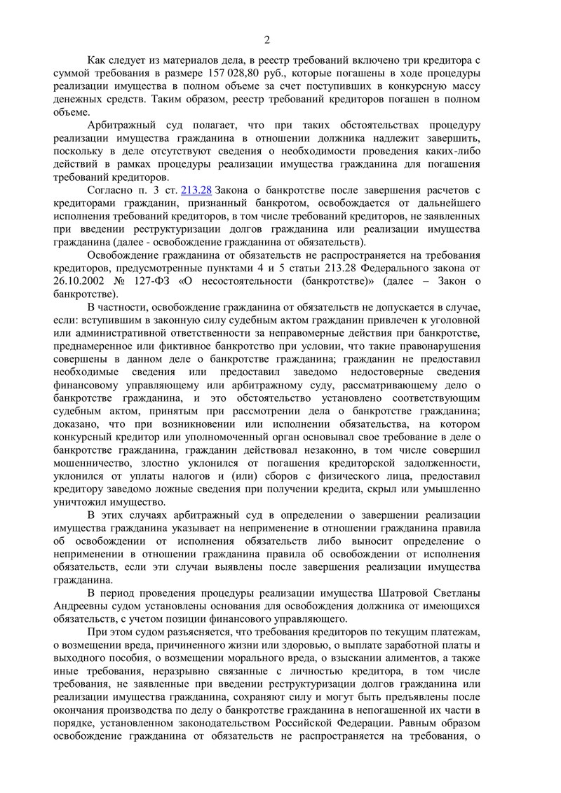 - Арбитражный суд определил завершить процедуру реализации имущества.