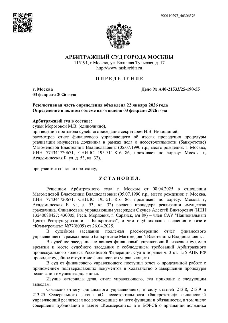 Дело № А40-21533/2025: Арбитражный суд города Москвы завершил процедуру банкротства и списал долги