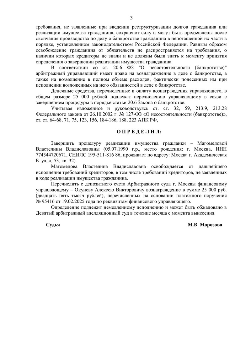 Суд также определил перечислить финансовому управляющему вознаграждение 25 000 руб. с депозитного счета Арбитражного суда г. Москвы (платежное поручение № 95416 от 19.02.2025), что подтверждает завершение процедуры в установленном порядке.