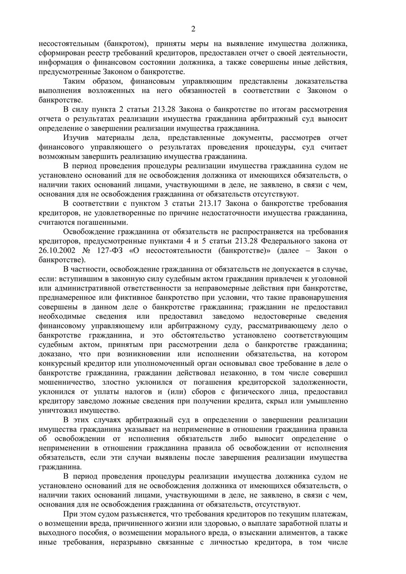 Рассмотрев отчет финансового управляющего, суд указал, что оснований для отказа в освобождении гражданина от обязательств не установлено и участниками процесса такие основания не заявлялись. Это означает, что суд не выявил недобросовестного поведения, сокрытия сведений или иных обстоятельств, которые могли бы помешать списанию долгов.