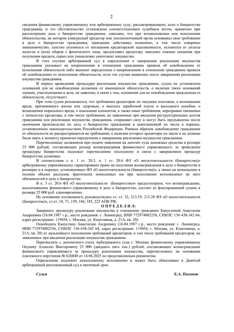 26 января 2026 года Арбитражный суд города Москвы вынес определение по делу №А40-22189/2025 и завершил процедуру реализации имущества нашего клиента. Суд освободил его от дальнейшего исполнения требований кредиторов, включая те, которые не были заявлены в процедуре.