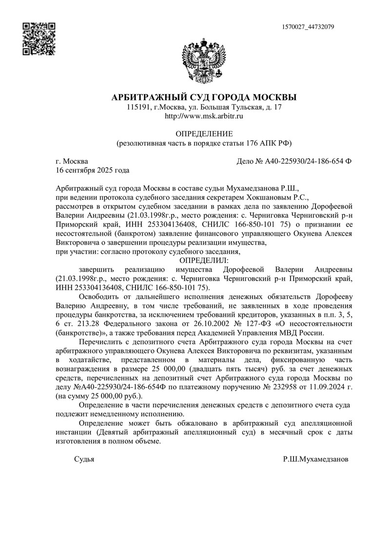 16 сентября 2025 года Арбитражный суд города Москвы вынес важное определение по делу № А40-225930/2024, и теперь клиент "ДОЛГАМ.НЕТ" официально освобождён от исполнения денежных обязательств после успешного завершения процедуры реализации имущества.
