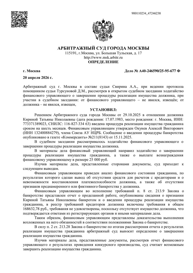 Дело № А40-246590/2025 (Арбитражный суд города Москвы): процедура банкротства завершена, клиент освобождён от долгов