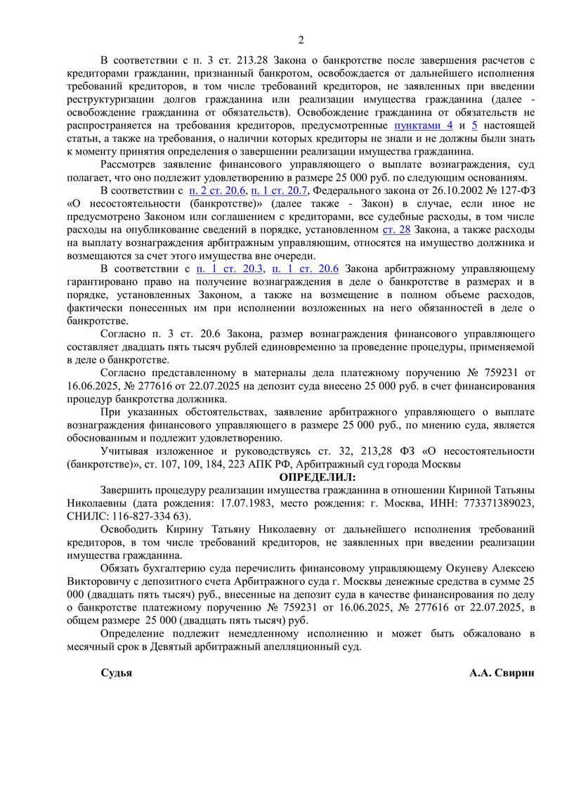 Определение подлежит немедленному исполнению и может быть обжаловано в месячный срок в Девятый арбитражный апелляционный суд. Для клиента же главный итог уже достигнут: процедура завершена, а долговые обязательства, заявленные кредиторами, прекращаются в установленном законом порядке.