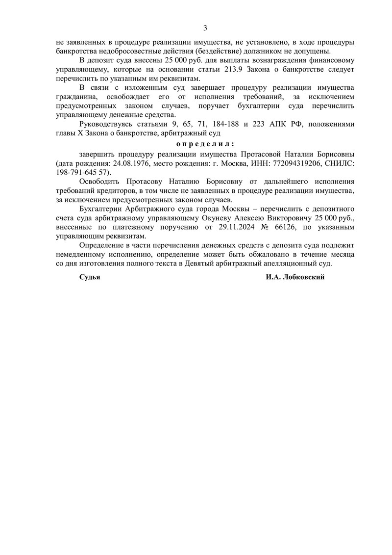 По делу №А40-272687/2024 суд определил завершить процедуру реализации имущества гражданина и освободить его от дальнейшего исполнения требований кредиторов, включая требования, не заявленные в процедуре, за исключением предусмотренных законом случаев. Определение может быть обжаловано в течение месяца в Девятый арбитражный апелляционный суд.