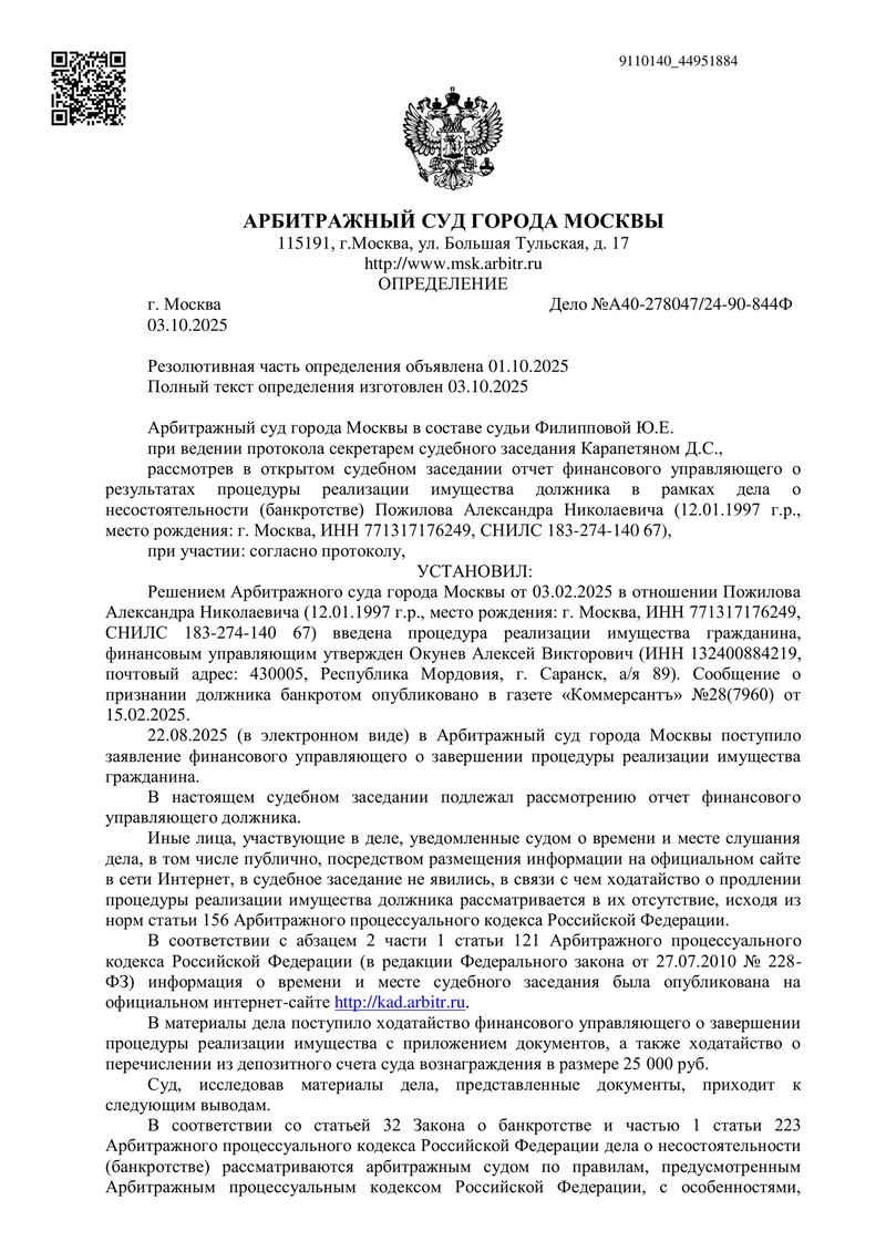 3 октября 2025 года в Арбитражном суде города Москвы было оглашено определение по делу №А40-278047/2024. Процедура реализации имущества в отношении нашего клиента была официально завершена, и все обязательства перед кредиторами клиента признаны погашенными. Это еще один яркий пример того, как команда "ДОЛГАМ.НЕТ" добивается для своих клиентов полного освобождения от долгов.