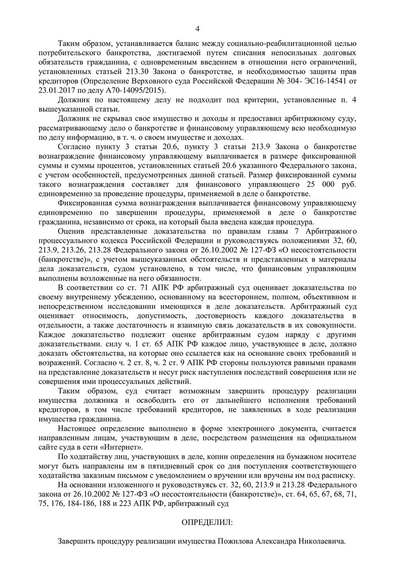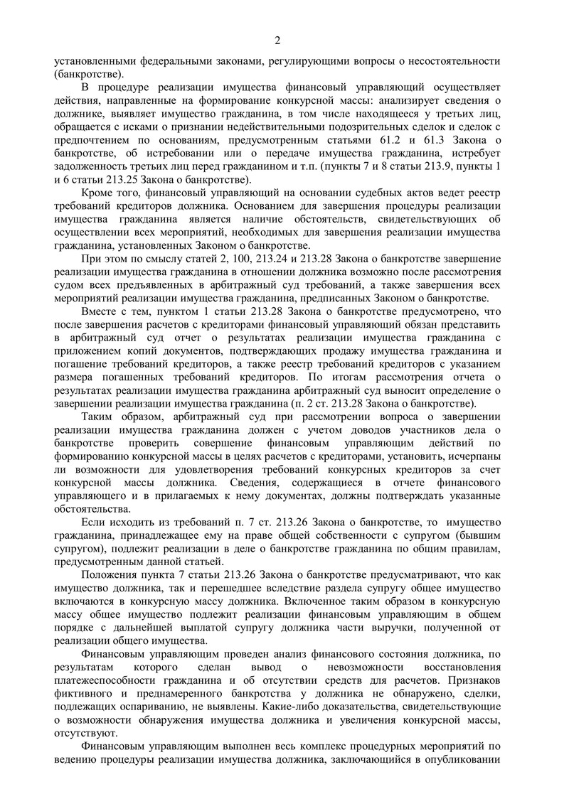 - Подготовка отчетности. Финансовый управляющий предоставил полный отчет о результатах процедуры, подтвердил невозможность полного удовлетворения требований кредиторов из-за отсутствия имущества и изложил свои выводы в официальном заключении, представленном в суд.
