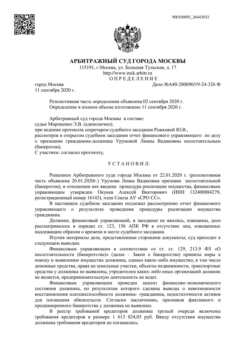 Решение суда было вынесено 11 сентября 2020 года. В ходе судебного заседания рассматривался отчет финансового управляющего.