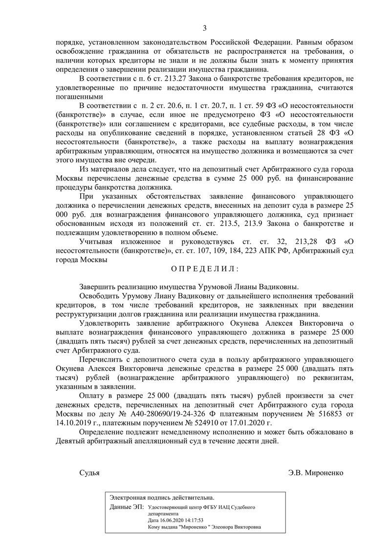 Мы рады сообщить об очередном успешном завершении дела клиента компании "ДОЛГАМ.НЕТ". Арбитражный суд города Москвы завершил процедуру реализации имущества должника и освободил его от дальнейшего исполнения обязательств перед кредиторами.