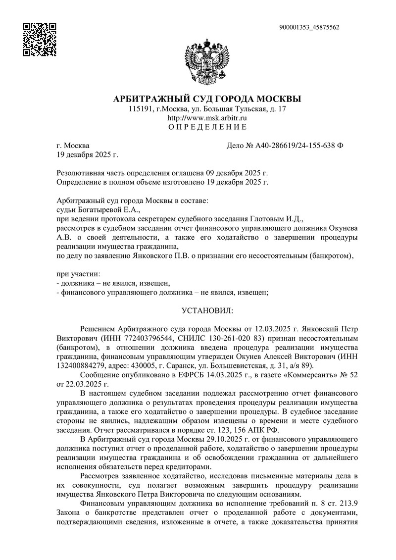 В Арбитражном суде города Москвы успешно завершилась процедура банкротства клиента "ДОЛГАМ.НЕТ". Суд определил завершить процедуру реализации имущества и освободить должника от дальнейшего исполнения требований кредиторов.