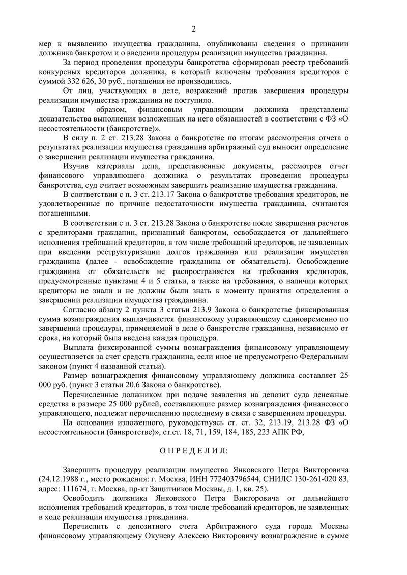 С правовой точки зрения это определение означает, что требования кредиторов, не удовлетворенные из-за недостаточности имущества, считаются погашенными. Для клиента "ДОЛГАМ.НЕТ" это финальная точка в судебном процессе и реальный результат — освобождение от долговой нагрузки в законном порядке.