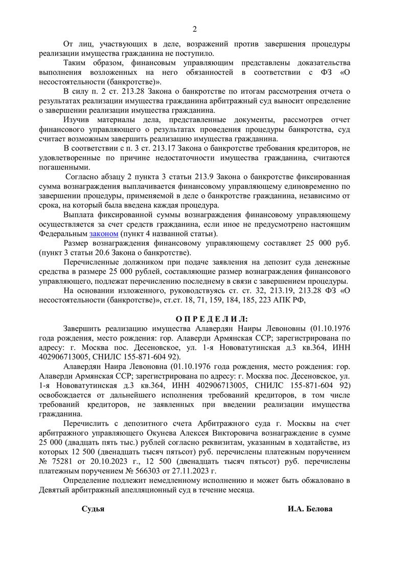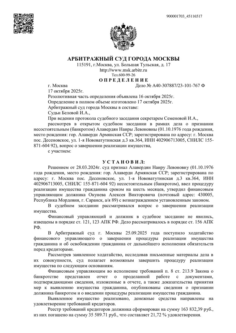 Арбитражный суд города Москвы под председательством судьи Беловой И.А. 17 октября 2025 года удовлетворил ходатайство финансового управляющего и завершил процедуру реализации имущества нашего клиента, признав его освобожденным от обязательств перед кредиторами.