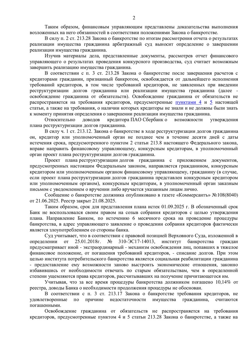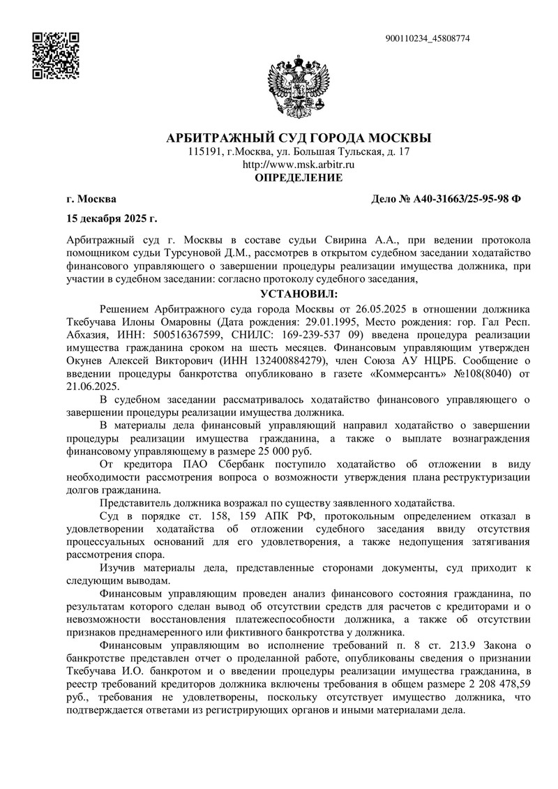 Еще один клиент "ДОЛГАМ.НЕТ" завершил процедуру банкротства физических лиц и получил законный результат — освобождение от дальнейшего исполнения требований кредиторов. Определение суда по делу №А40-31663/2025 подтверждает, что процесс прошел корректно, а финансовый управляющий выполнил все обязательные мероприятия.