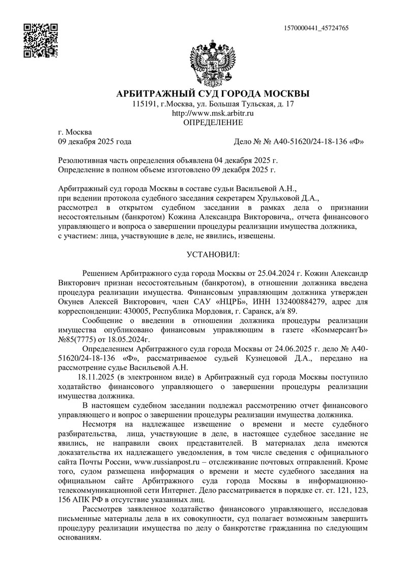 Арбитражный суд города Москвы вынес определение о завершении процедуры реализации имущества в деле № А40-51620/2024. Благодаря профессионализму специалистов "ДОЛГАМ.НЕТ" наш клиент навсегда избавился от своего многолетнего долгового бремени!