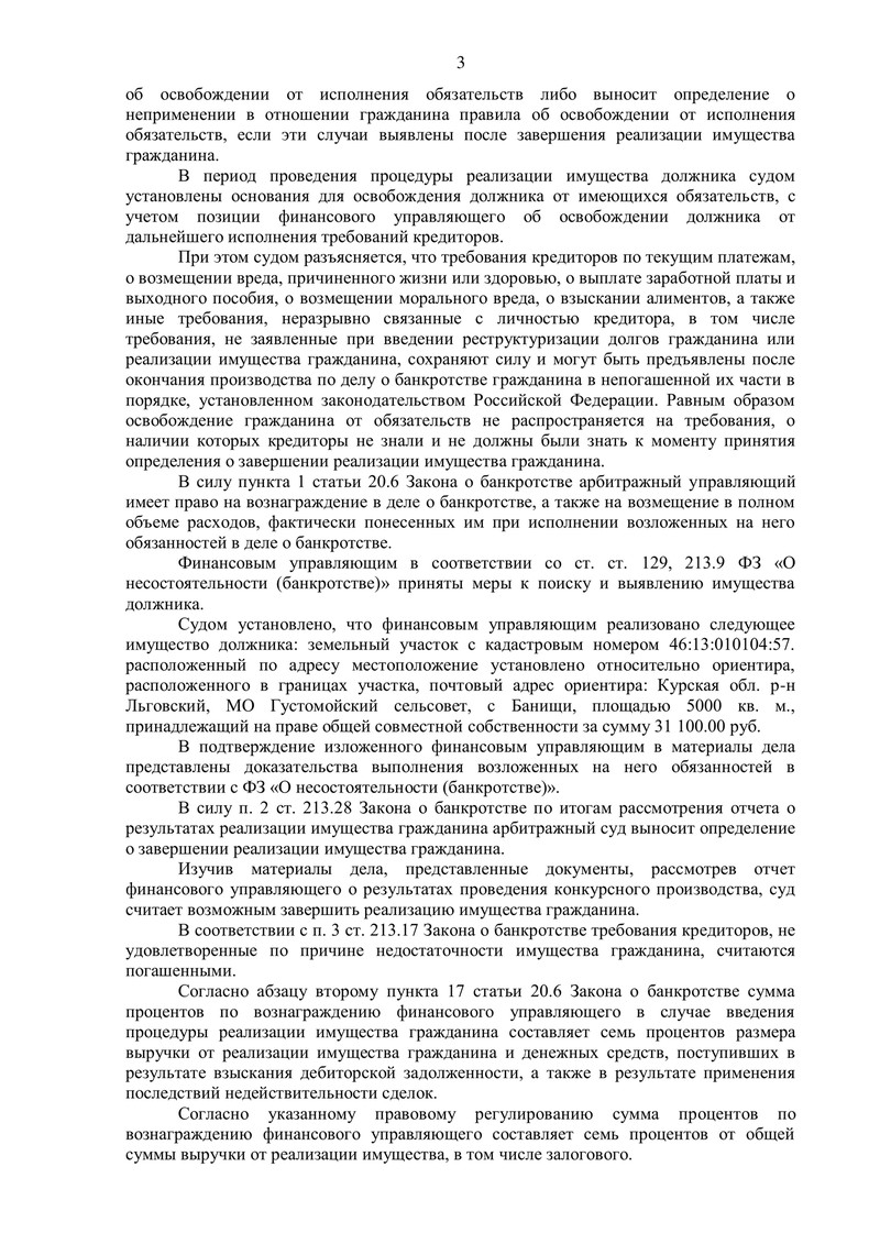Работа финансового управляющего включала поиск имущества для реализации в интересах кредиторов. Был выявлен и продан земельный участок в Курской области, который находился в совместной собственности должника. Выручка от реализации составила 31 100 руб. Суд проверил добросовестность клиента: признаков фиктивного или преднамеренного банкротства, а также сомнительных сделок обнаружено не было.