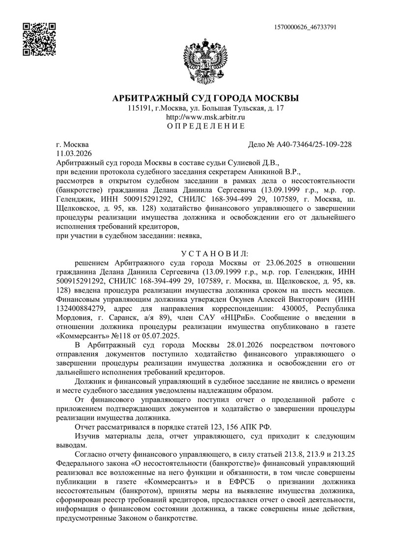 Еще одно выигранное дело в копилке ДОЛГАМ.НЕТ: 11.03.2026 Арбитражный суд города Москвы рассмотрел отчет финансового управляющего и суд определил завершить процедуру реализации имущества гражданина, а также освободить должника от дальнейшего исполнения требований кредиторов. Дело рассматривала судья Д.В. Сулиева.
