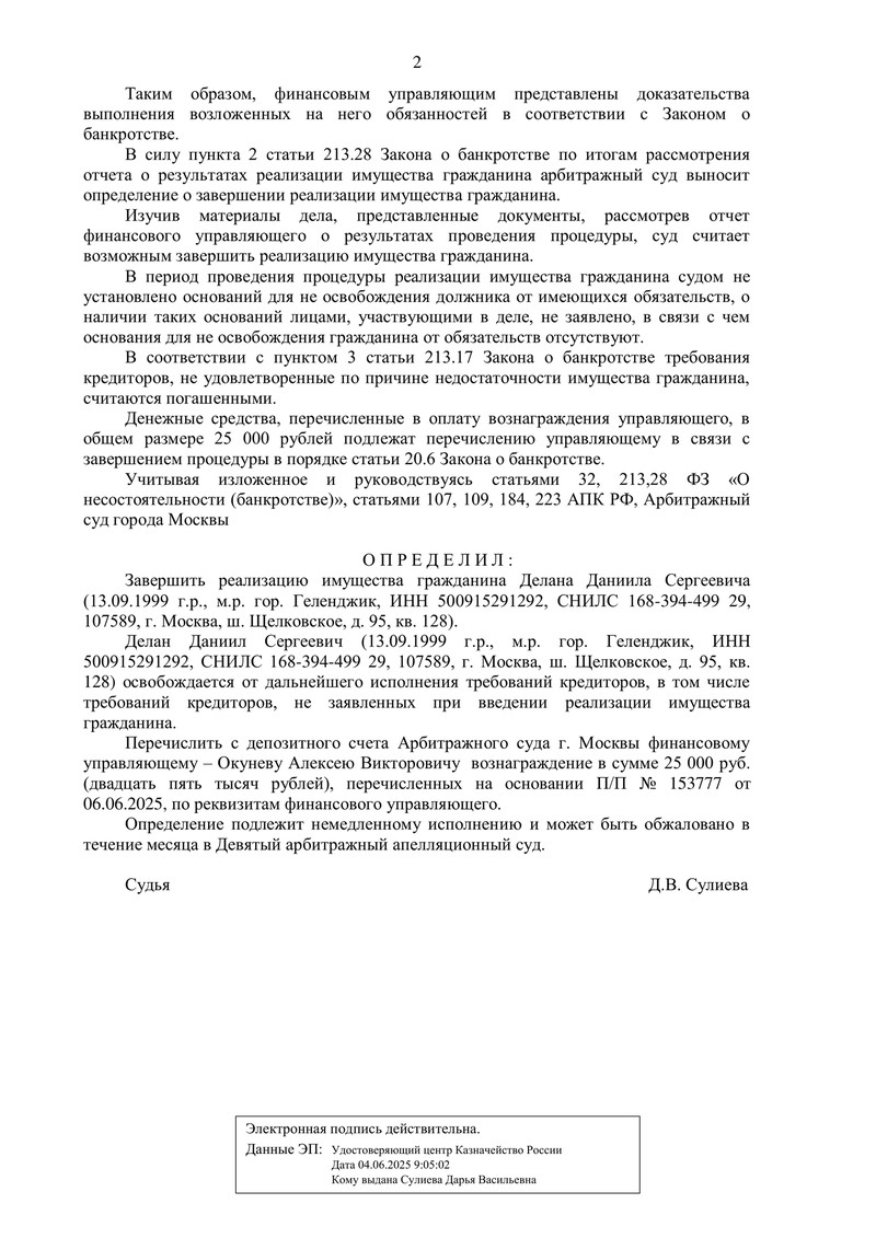 Отдельно суд разрешил вопрос о вознаграждении финансового управляющего: 25 000 руб. подлежат перечислению с депозитного счета суда в порядке статьи 20.6 Закона о банкротстве.