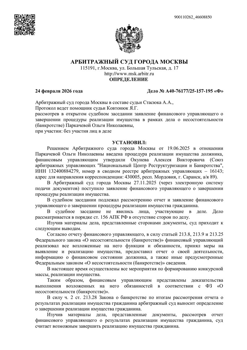 Дело № А40-76177/2025 — еще одно завершенное банкротство физического лица с освобождением от долгов при сопровождении ДОЛГАМ.НЕТ. 24 февраля 2026 года Арбитражный суд города Москвы под председательством судьи А.А. Стасюка рассмотрел заявление финансового управляющего о завершении процедуры реализации имущества и вынес итоговое определение по делу.