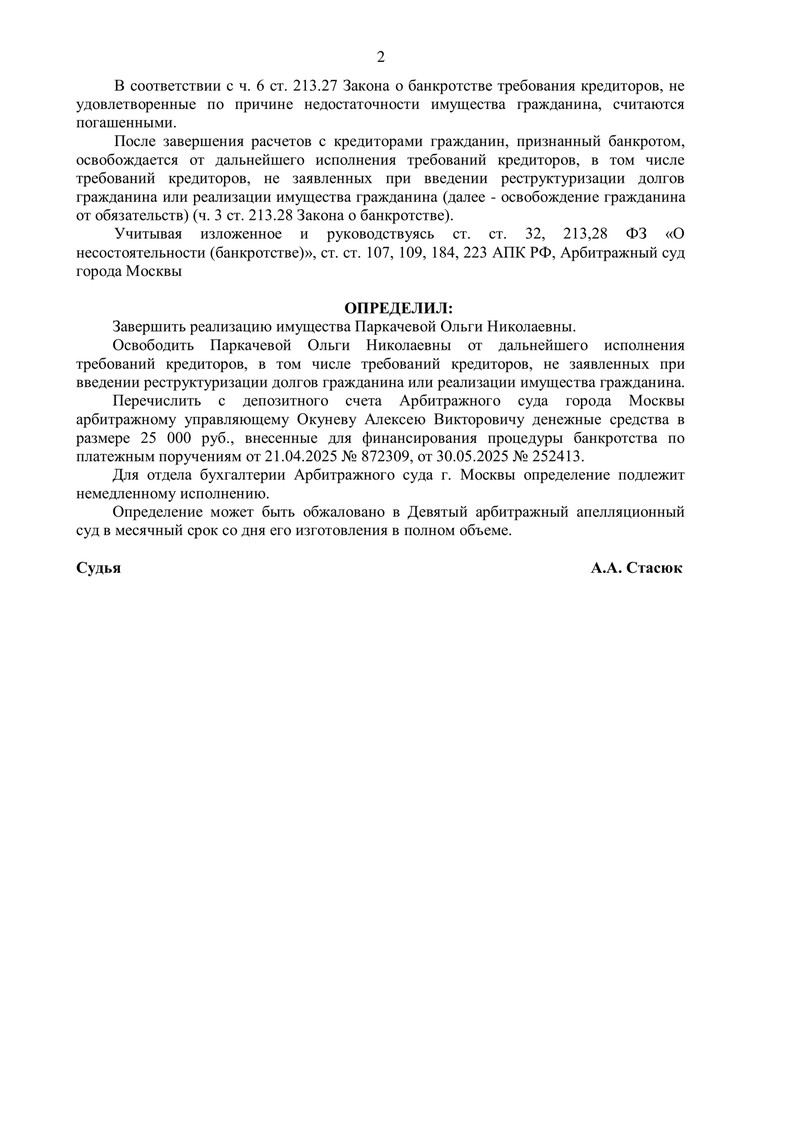 Дополнительно суд определил перечислить финансовому управляющему 25 000 руб. с депозитного счета Арбитражного суда города Москвы — это вознаграждение, внесенное для финансирования процедуры (платежные поручения от 21.04.2025 № 872309 и от 30.05.2025 № 252413). Определение в этой части подлежит немедленному исполнению.