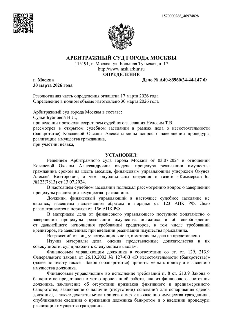 - завершить процедуру реализации имущества гражданина по делу №А40-83960/2024,