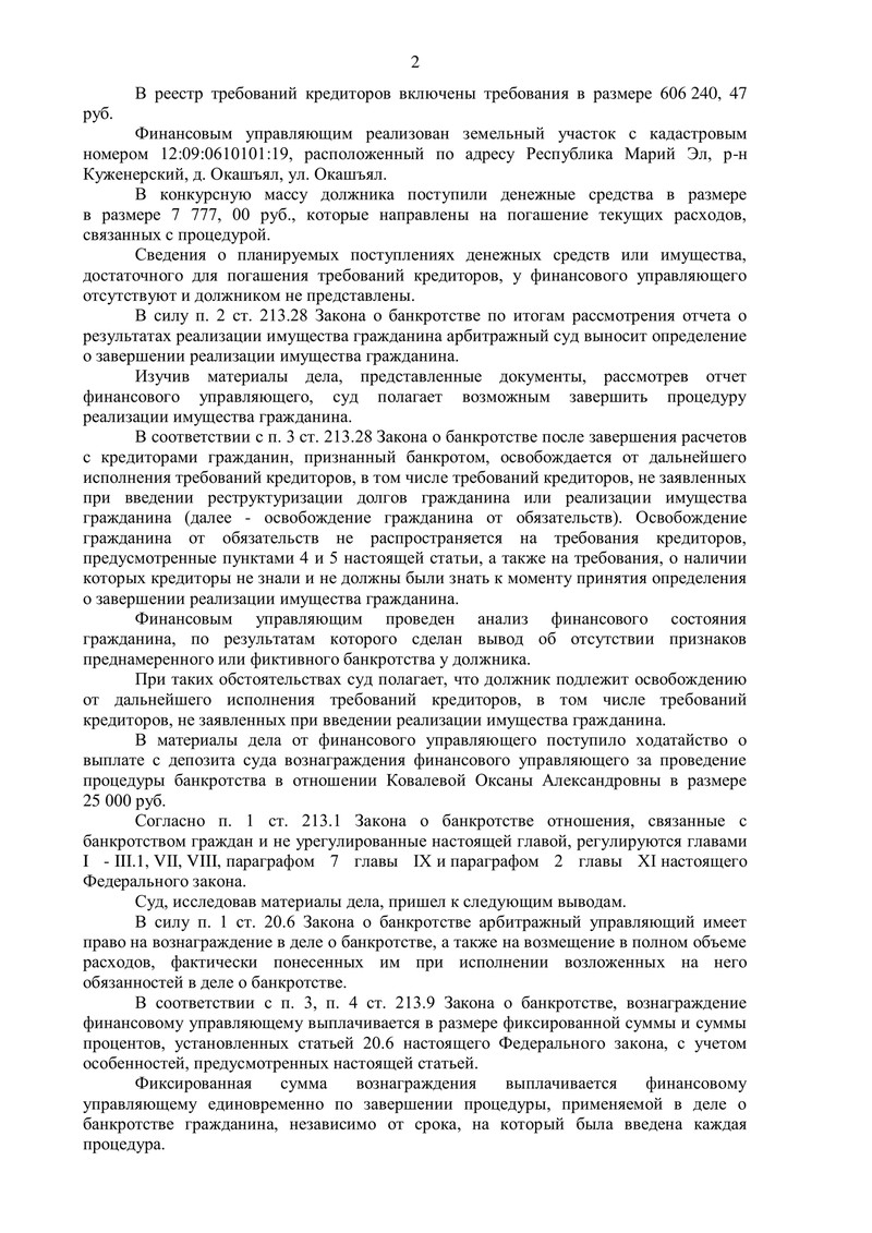 Финансовым управляющим был реализован земельный участок. По итогам мероприятий в конкурсную массу поступили денежные средства в размере 7 777 руб. — они были направлены на покрытие текущих расходов процедуры. Суд также установил, что сведений о планируемых поступлениях денежных средств или имущества, достаточного для расчетов с кредиторами, не имеется.