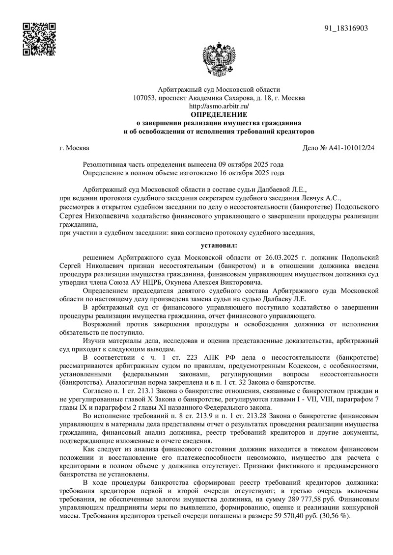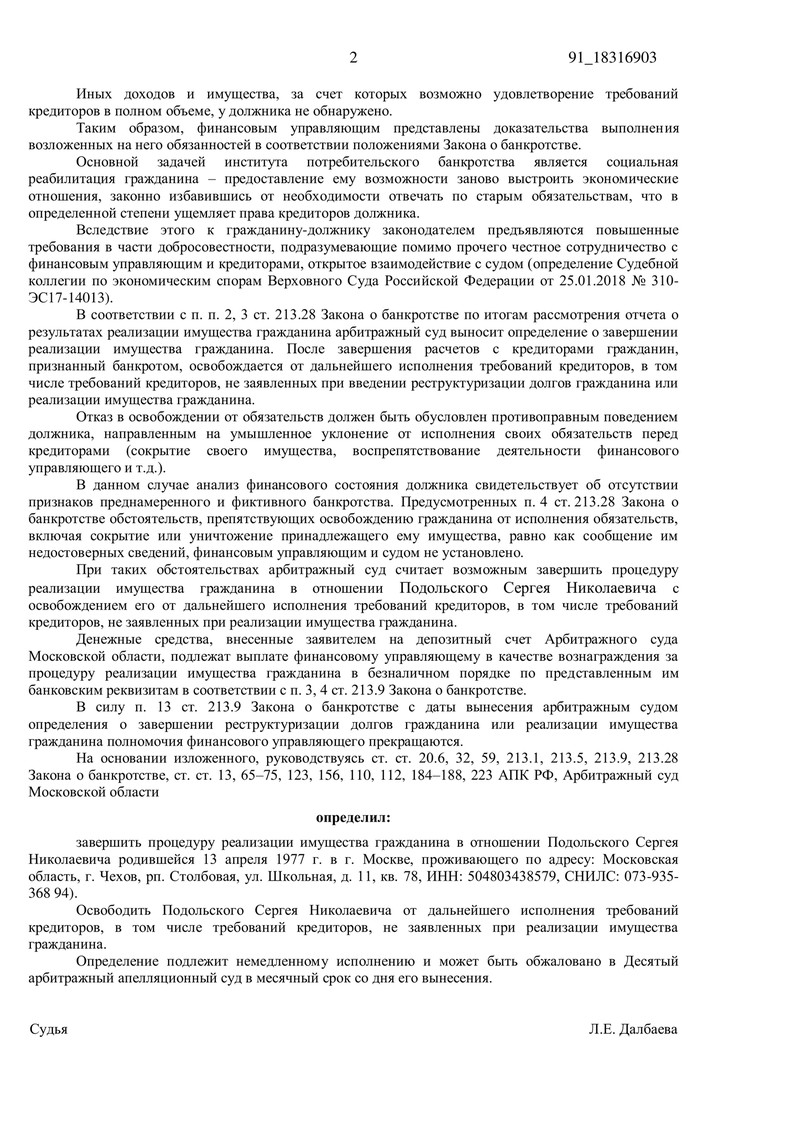 В октябре 2025 года клиент компании ДОЛГАМ.НЕТ получил долгожданное судебное определение о завершении процедуры реализации имущества и полном освобождении от долговых обязательств перед кредиторами. Процесс рассматривался в Арбитражном суде Московской области под председательством судьи Л.Е. Далбаевой, что ещё раз подтверждает высокий профессионализм команды ДОЛГАМ.НЕТ в решении самых сложных вопросов банкротства физических лиц.