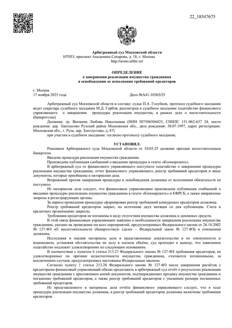 С радостью делимся с Вами историей успешного завершения дела №А41-10365/2025 о банкротстве физического лица в Арбитражном суде Московской области. Клиент "ДОЛГАМ.НЕТ" полностью избавился от непосильного долгового груза, и это не просто очередное судебное решение, а реальный пример того, как грамотная юридическая поддержка помогает освободиться от кредитного бремени и начать новую финансовую жизнь!
