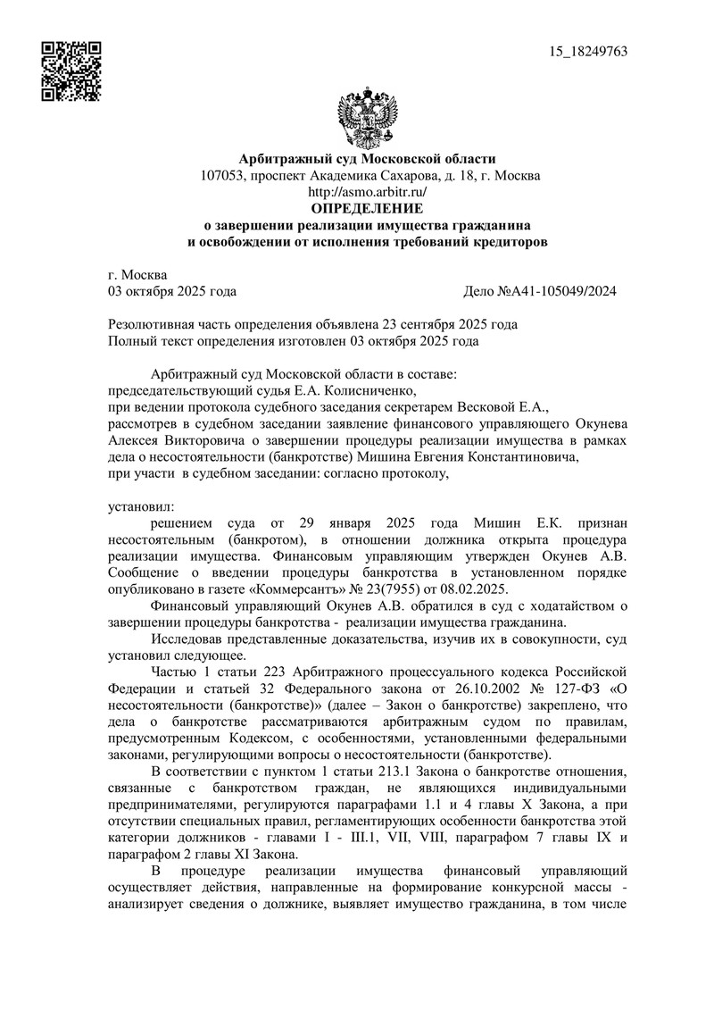 Важное судебное событие состоялось 3 октября 2025 года в Арбитражном суде Московской области: еще один клиент компании "ДОЛГАМ.НЕТ" был официально освобождён от всех задолженностей перед кредиторами. Это ещё одно подтверждение эффективной работы наших экспертов — мы последовательно доказываем, что даже самые сложные долговые ситуации могут быть разрешены в пользу гражданина!