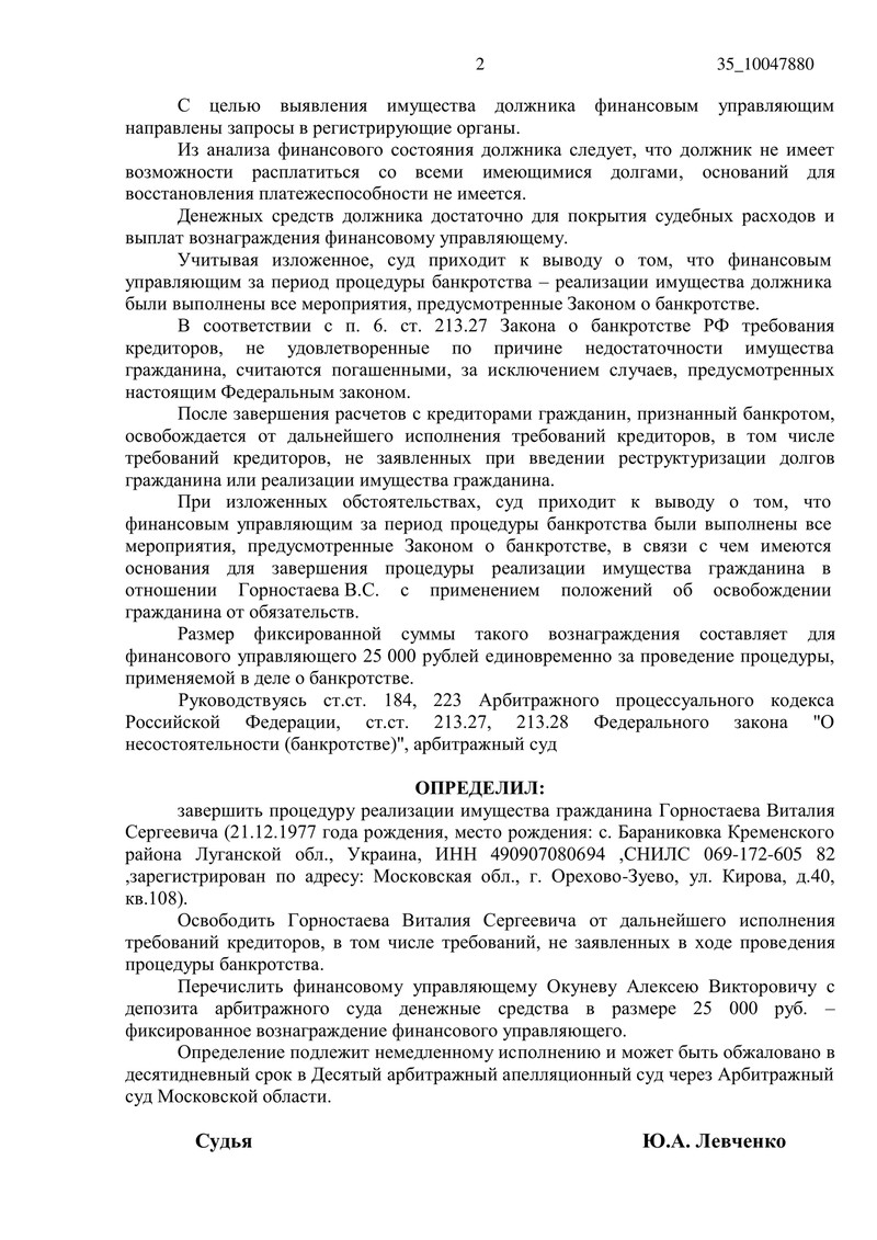 Суд проанализировал все представленные доказательства и пришел к выводу о невозможности восстановления платежеспособности нашего клиента. После завершения расчетов с кредиторами суд постановил освободить должника от оставшихся долговых обязательств, в том числе от тех, которые не были заявлены в ходе процедуры банкротства.