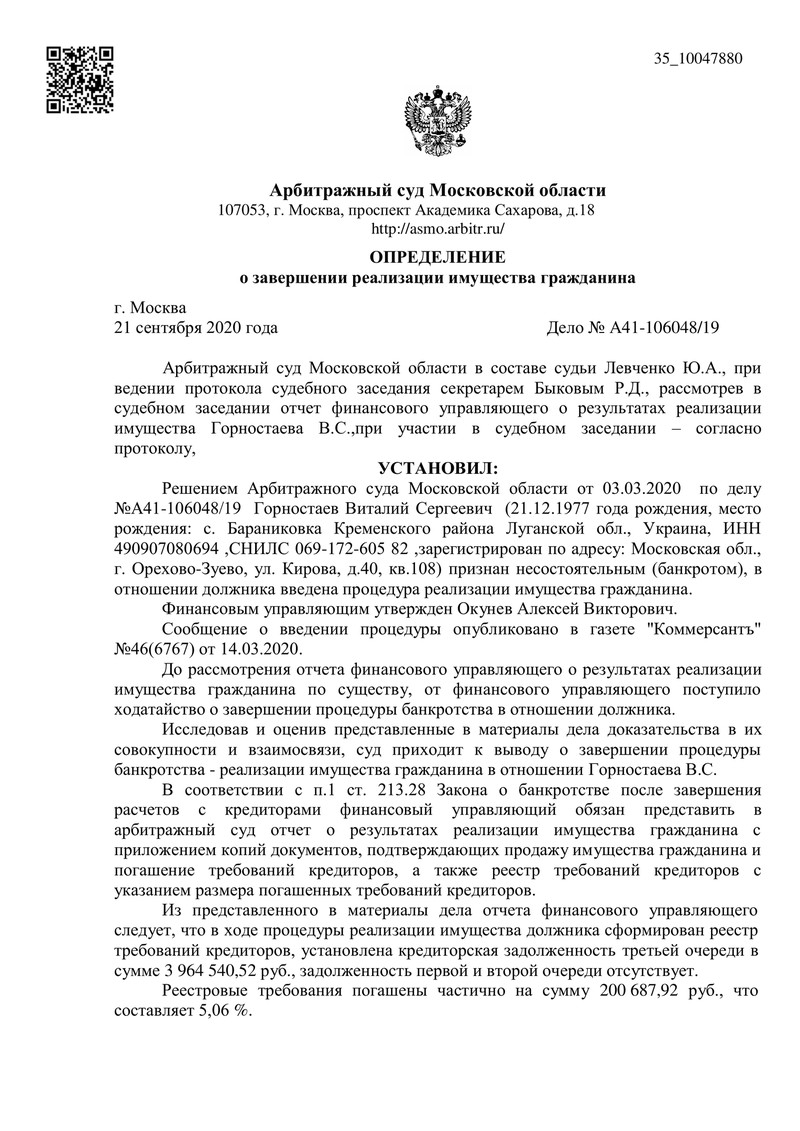 Еще одно дело завершено в Арбитражном суде Московской области. Компания "ДОЛГАМ.НЕТ" помогла своему клиенту избавиться от долгов и обрести финансовую свободу. 21 сентября 2020 года судья Левченко Ю.А. вынес определение о завершении процедуры реализации имущества гражданина по делу № А41-106048/2019.