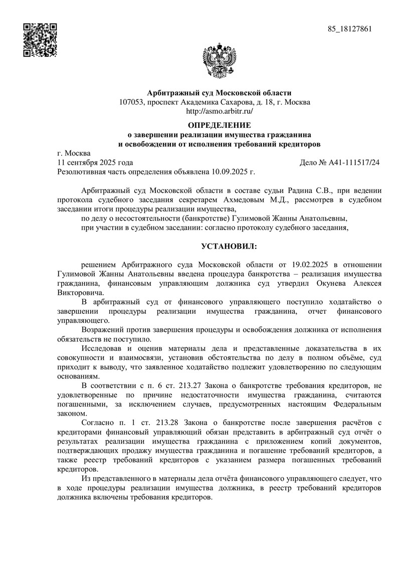 Осенью 2025 года в Арбитражном суде Московской области завершилась процедура банкротства очередного клиента компании "ДОЛГАМ.НЕТ". Это дело — ещё одно убедительное подтверждение профессионализма команды и уникального, клиентоориентированного сервиса.