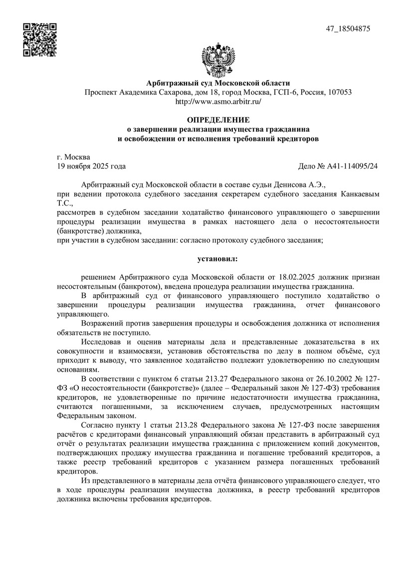 Очередной счастливый клиент ДОЛГАМ.НЕТ: полное освобождение от долгов по делу № А41-114095/2024